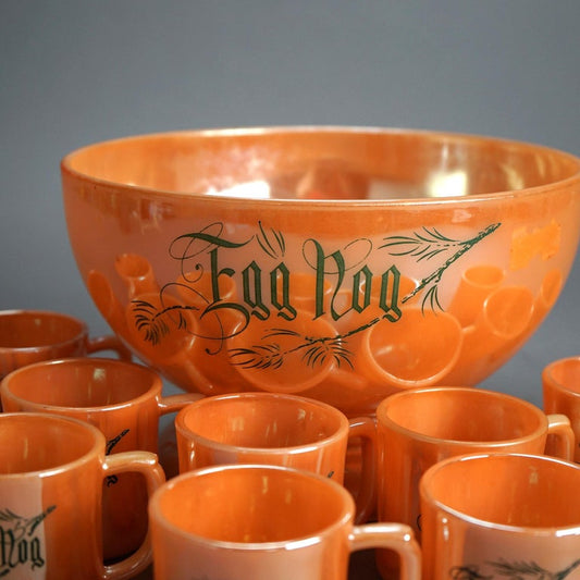 13 Piece Orange Luster Glass Eggnog Punch Bowl Set C1930