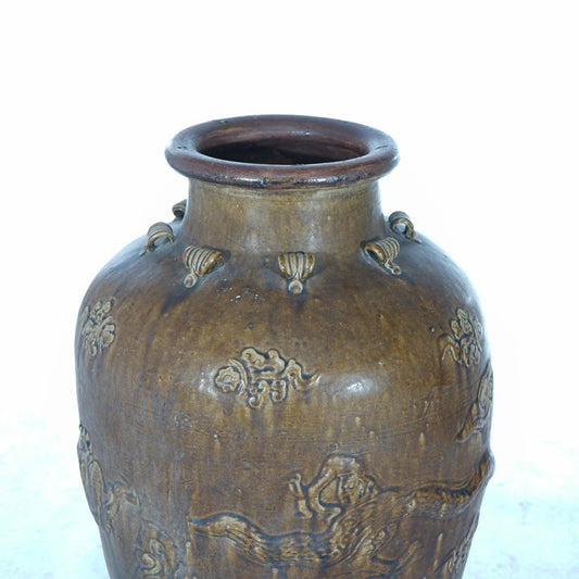 Antique 35" Chinese Floral & Figural Dragon Embossed Pottery Floor Vase 19thC