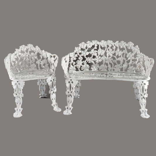 Antique Grape & Leaf White Painted Cast Iron Garden Set, Settee & Chair, c1900