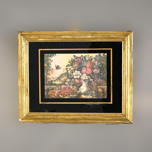 Antique Still Life Floral Print In Original Gilt Frame with Eglomise Glass C1880