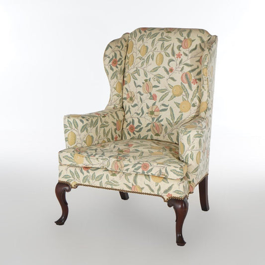 English Queen Anne Style Upholstered & Mahogany Fireside Wingback Chair 20th C