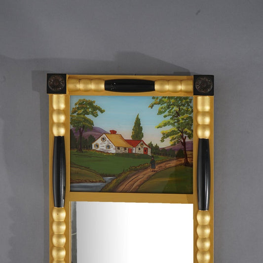 Empire Style Ebonized & Gilt Mirror, Hand Painted Eglomise Scenic Panel 20thC
