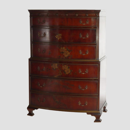 Floral Painted Chinese Chippendale Mahogany Six Drawer Highboy Chest c1920