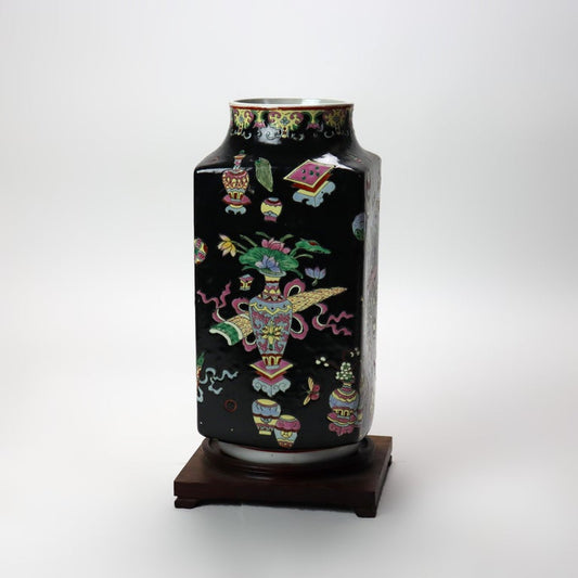 Vintage Chinese Enameled Porcelain Vase With Wood Base Signed C1940
