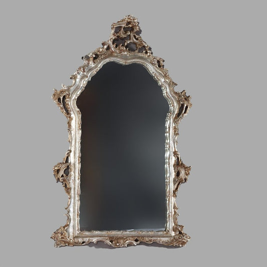 Vintage French Louis XIV Rococo Floral Silver Carved Wood Mirror c1950
