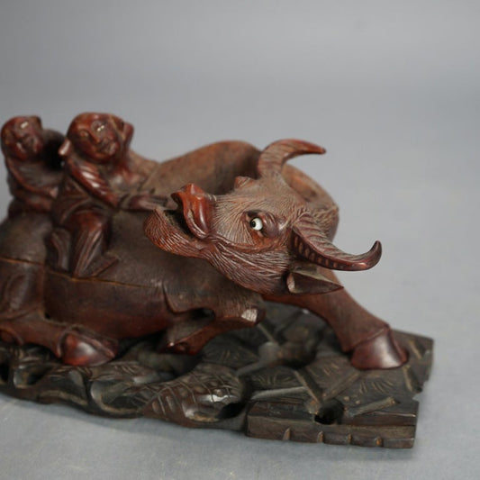 Antique Chinese Carved Wood Sculpture of Water Buffalo with Figures C1920