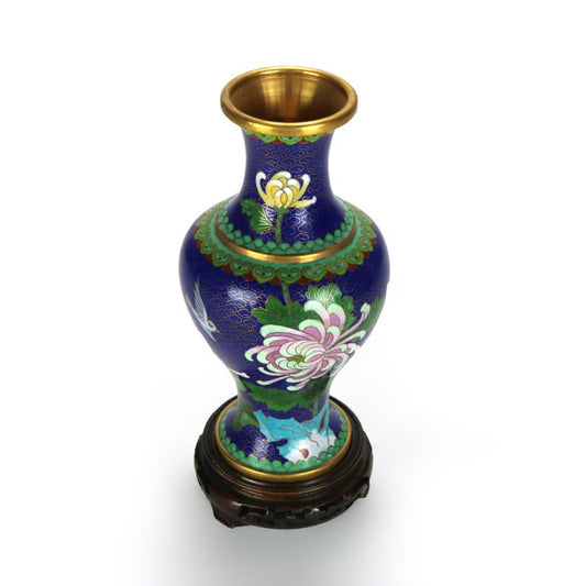 Antique Chinese Cloisonne Enameled Floral Vase with Peony & Wood Base c1930