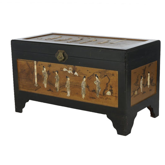 Antique Chinese Lacquered Ebonized & Gilt Blanket Chest with Mother of Pearl