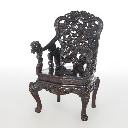 Antique Chinese Deeply Carved Rosewood Figural Queen Chair with Dragons C1920