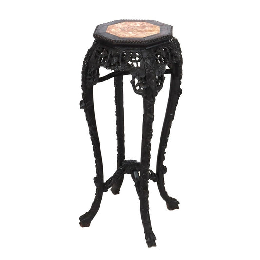 Antique Chinese Floral Carved Hardwood Stand With Rouge Marble Top c1910