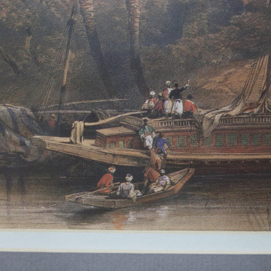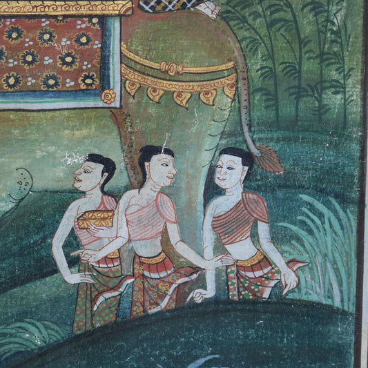 Thai Watercolor on Paper Genre Scene with Figures, Elephant & Horses 20thC