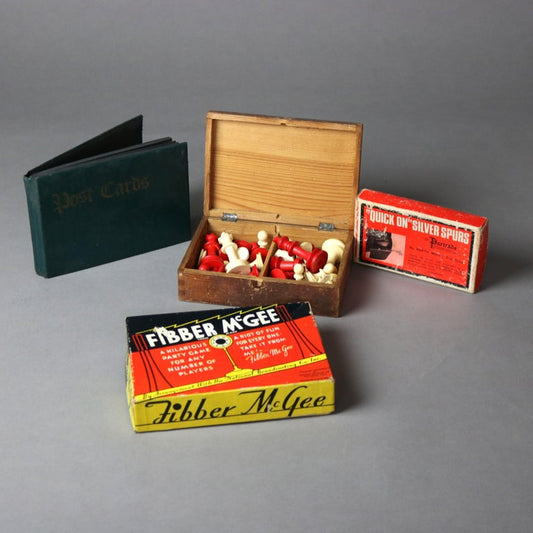 Lot of Four Miscellaneous Antique Items: Chess Pieces, Spurs, Game & Post Cards