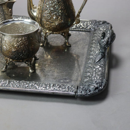Six-Piece Antique Silver Plated Floral Repousse Tea Set C1890