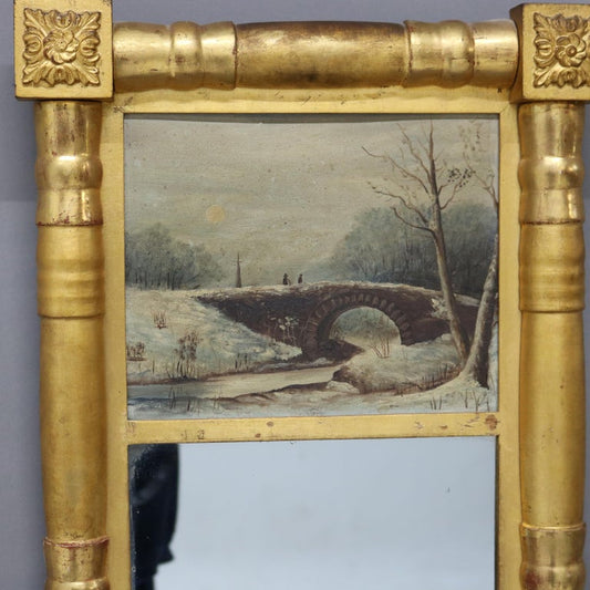 Antique American Empire Giltwood Wall Mirror & Oil on Board Landscape Painting