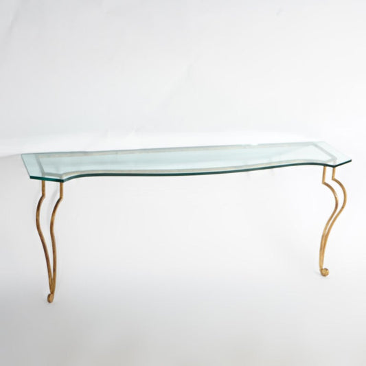 • Italian Gold Gilt Wrought Iron Console Table with Glass Top 20th C