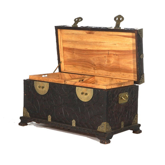 • Antique Chinese Blanket Wedding Chest Carved in Relief with Floral Design C1890