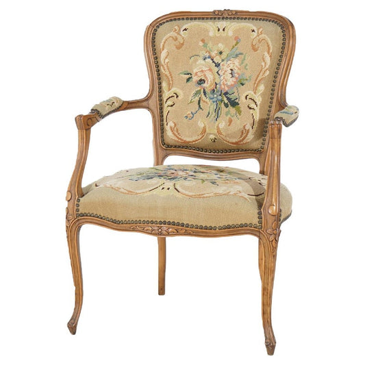 • Antique French Louis XV Style Carved Walnut Needlepoint Upholstered Chair C1920