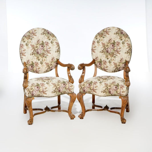 Antique Pair Italian Walnut Carved Arm Chairs, circa 1920