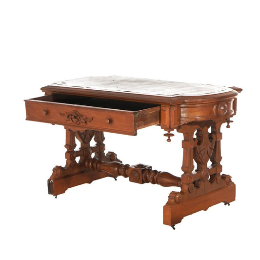 Antique Victorian Renaissance Revival Carved Walnut Trestle Form Desk C1890
