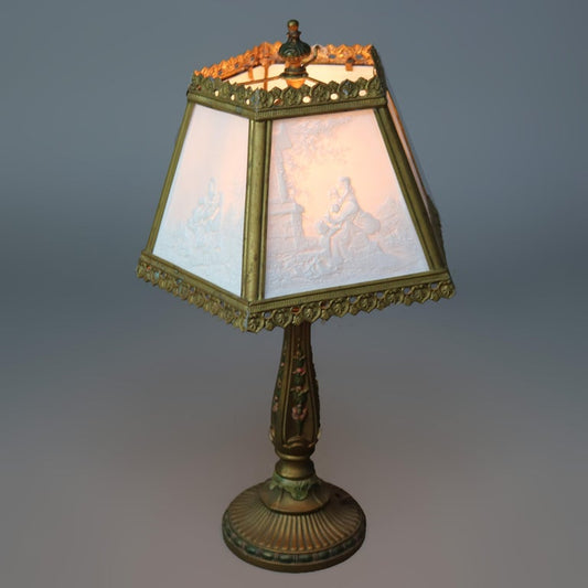 Antique Lithophane Arts & Crafts Embossed 5 Panel Glass Table Lamp C1910