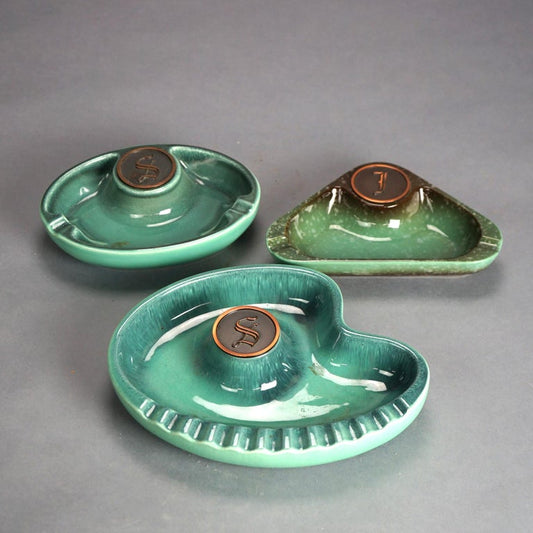 • Three Mid Century Modern Roseville Hyde Park Art Pottery Ashtrays Mid 20thC