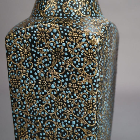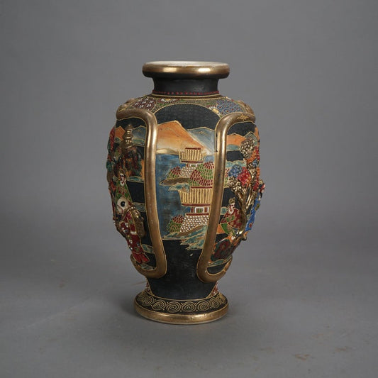 • Antique Japanese Satsuma Gilt & Embossed Figural Pottery Vase C1930