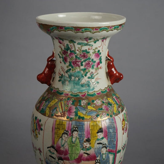• Vintage Chinese Porcelain Vase with Genre Scene & Garden Flowers, Stamped, C1930
