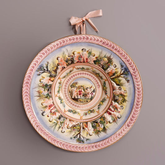 Large Italian Capodimonte Porcelain Center Bowl, Cherubs Scene in Relief, 20th C
