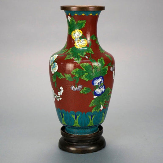 Antique Chinese Cloissone Enameled Vase with Bronze Base, Garden Themed, c1900
