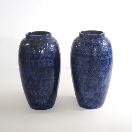 Pair Antique Roseville Art Pottery Floral Embossed Vases with Mottled Blue Glaze