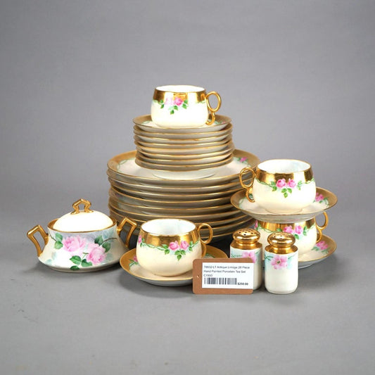 Antique Limoges 28 Piece Hand Painted & Gilt Pink Rose Porcelain Tea Set C1900