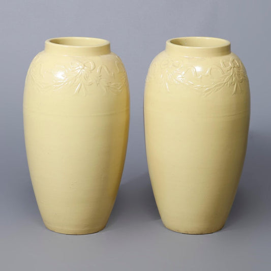 Pair Galloway Ribbon & Garland Embossed Art Pottery Floor Vases C1930