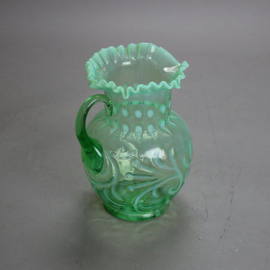 Antique Victorian Green & Opalescent Glass Pitcher with Ruffled Rim C1900
