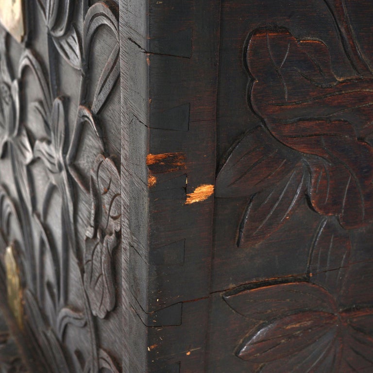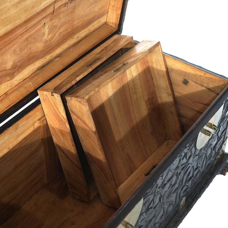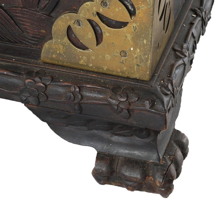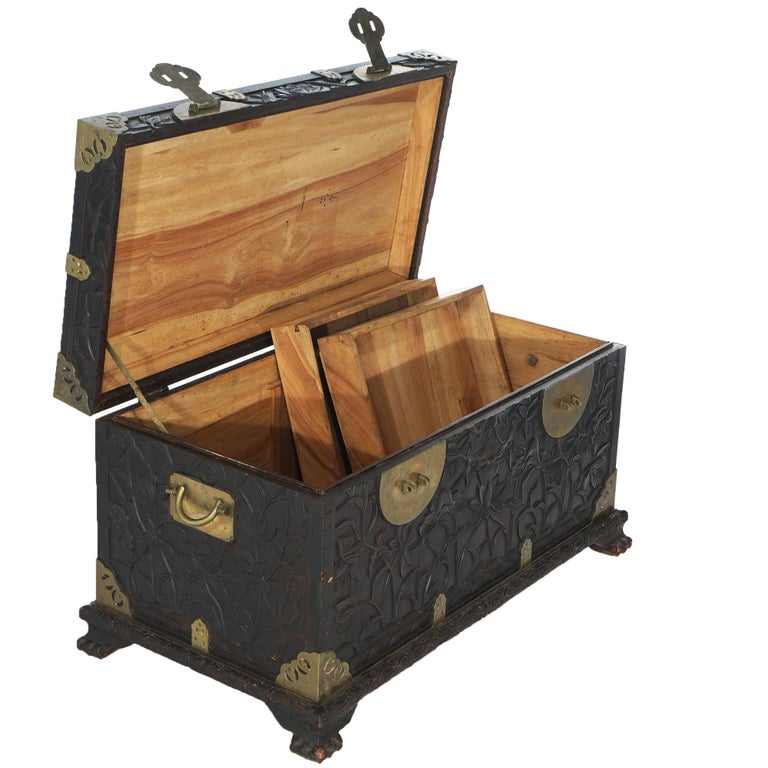 - Antique Chinese Blanket Wedding Chest Carved in Relief with Floral Design and Brass Hardware C1890