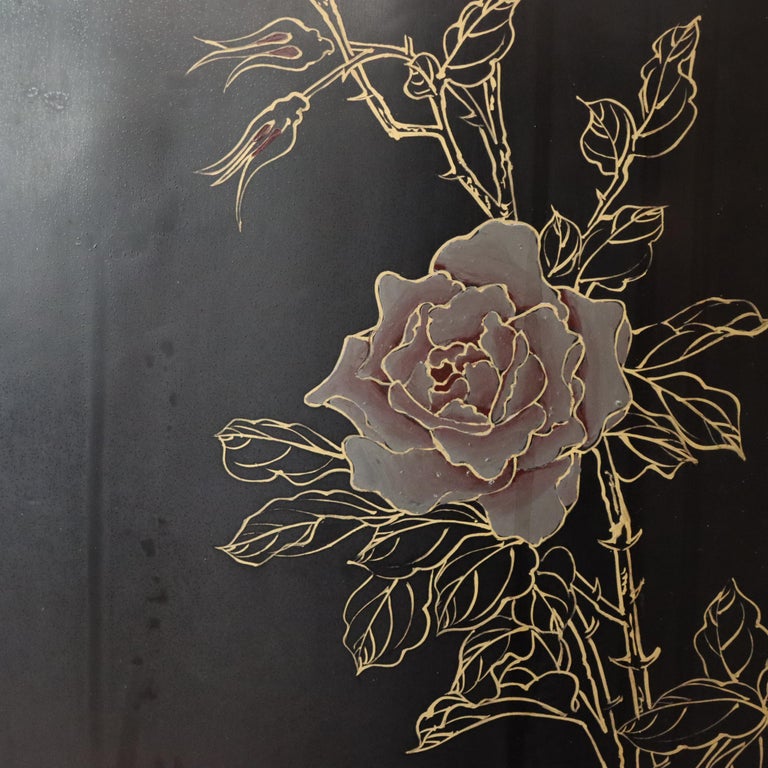- An early 20th-century Chinese dressing screen featuring six ebonized panels. Each panel features intricate figural and floral garden scene carvings made from hardstone, showcasing traditional Chinese artistry. The screen displays a blend of natural motifs, including birds and flowers, set against a dark, elegant background.