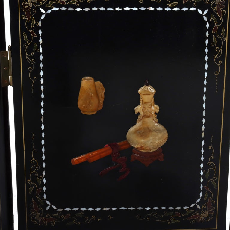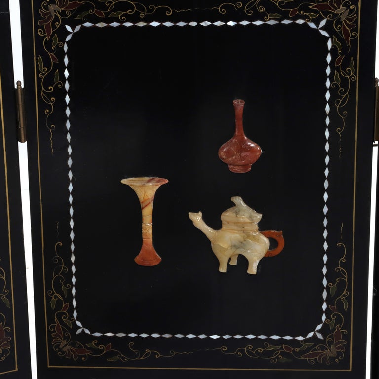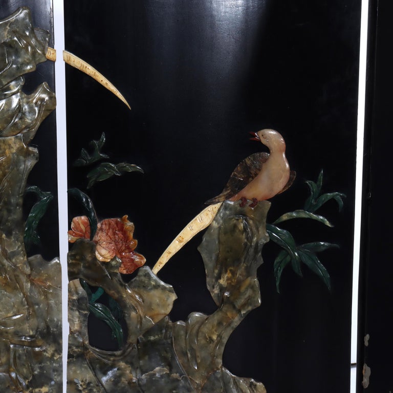 - Antique Chinese Ebonized Six Panel Dressing Screen with Garden Figural & Floral Carved Hardstone Elements Early 20thC
