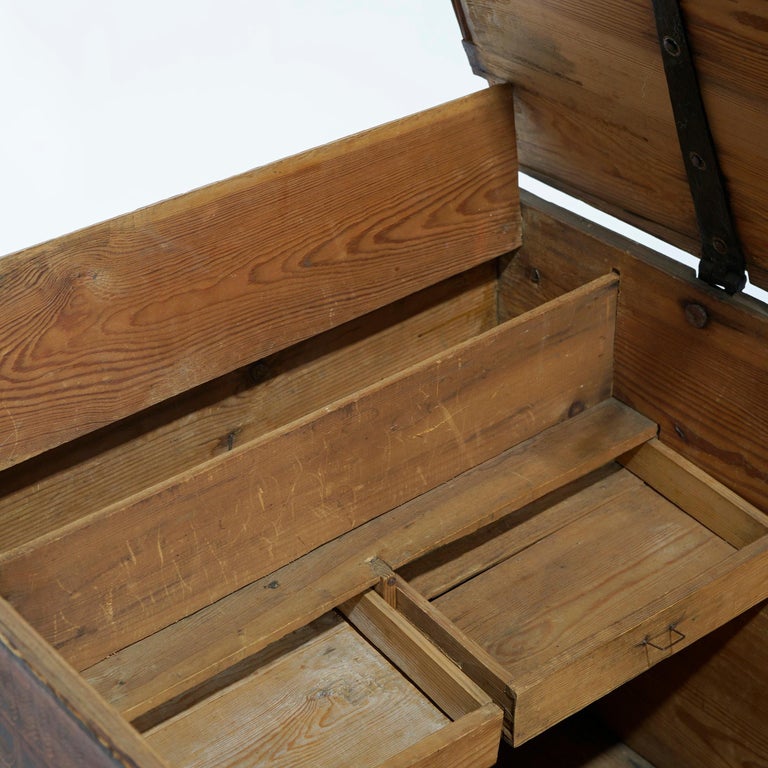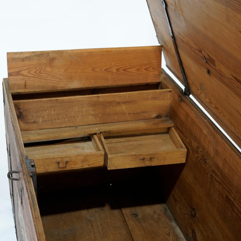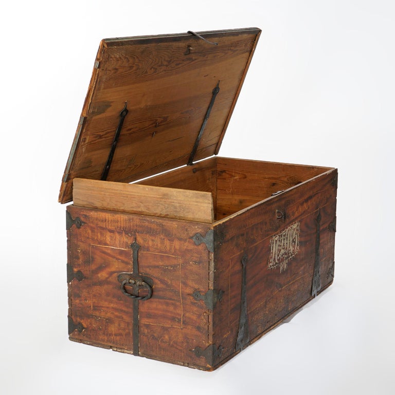 -An antique Folk Art blanket chest or trunk offers grain painted wood construction with central date of 1846, strap hinges and interior patch box and drawers as photographed.