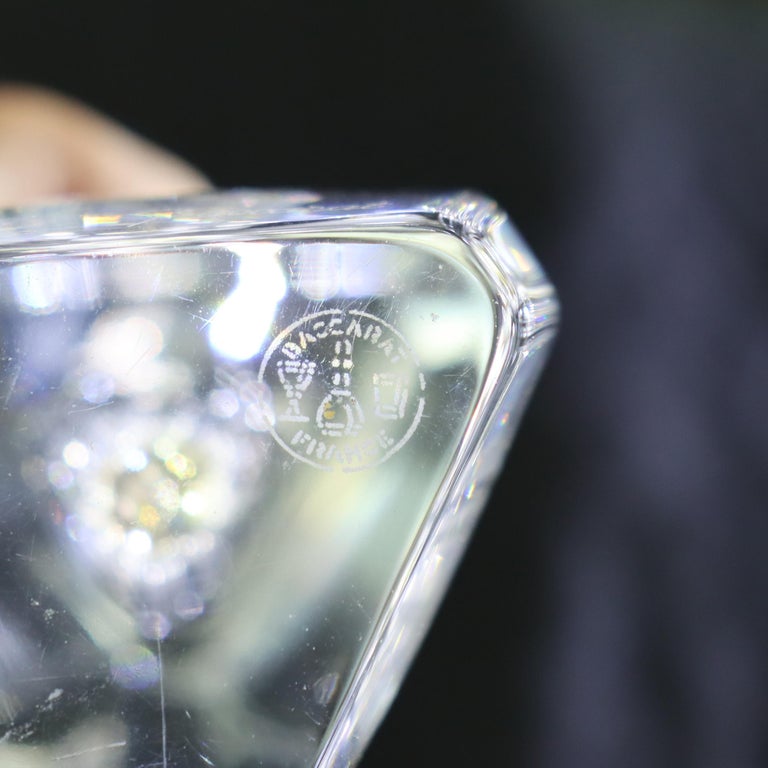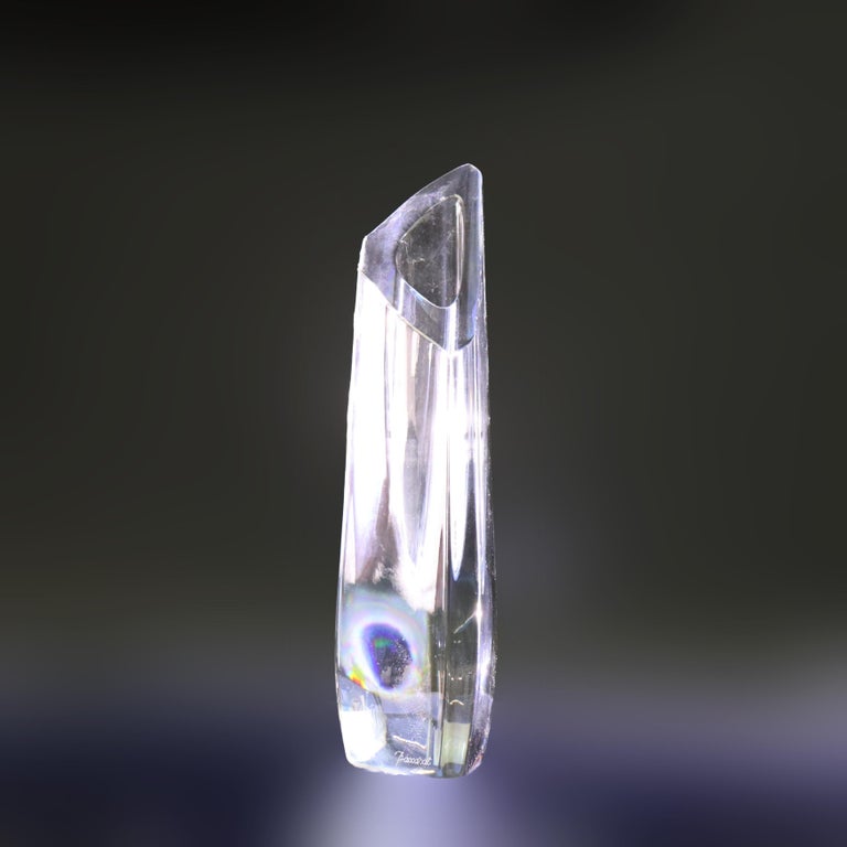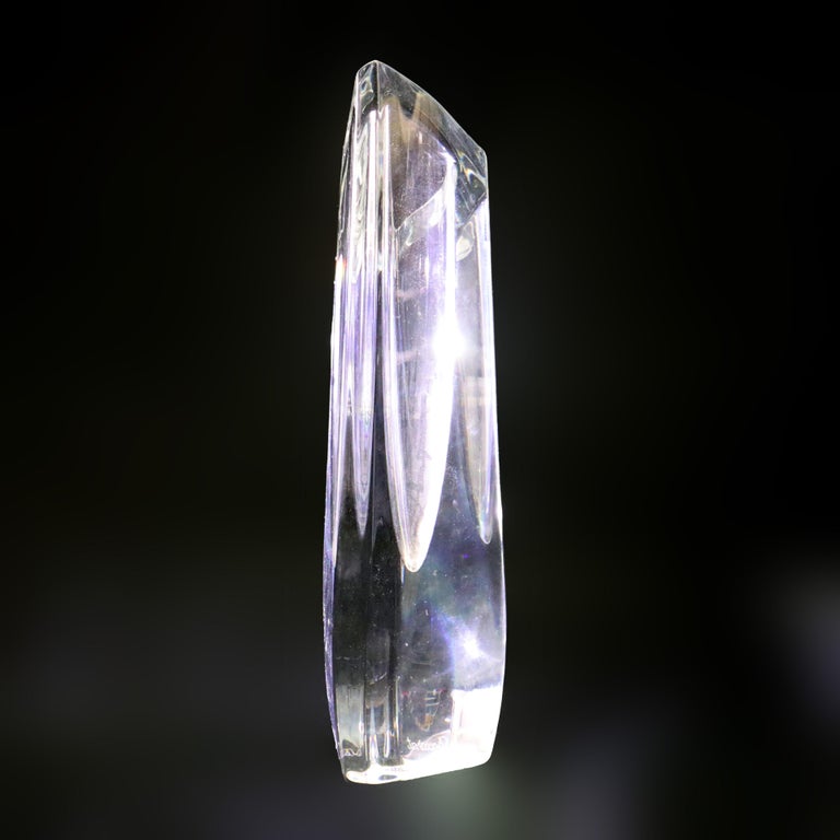 - This antique French Baccarat bud vase, crafted around 1930, showcases the elegance and precision of mid-century modern art glass. The vase features a sleek, geometric design typical of the era, with a clear, polished finish that highlights its sophisticated form. Signed by Baccarat, a renowned name in luxury glassware, this piece exemplifies the brand's commitment to quality and artistry.