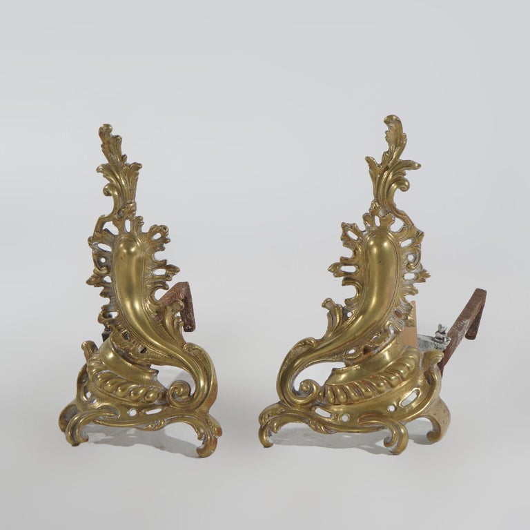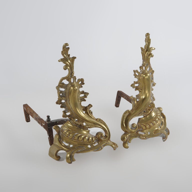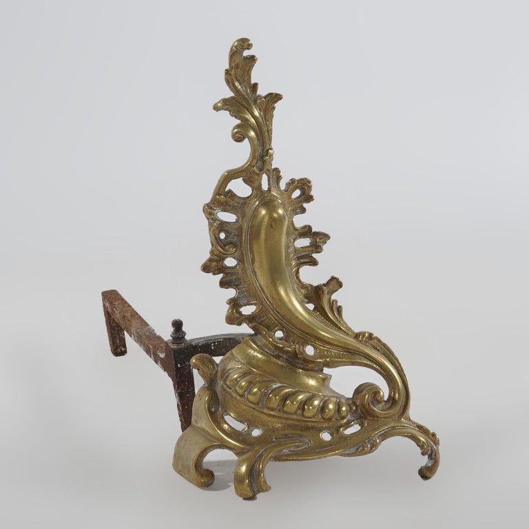- Antique French Louis XIV Bronze Foliate Form Fireplace Andiron Chenets C1890