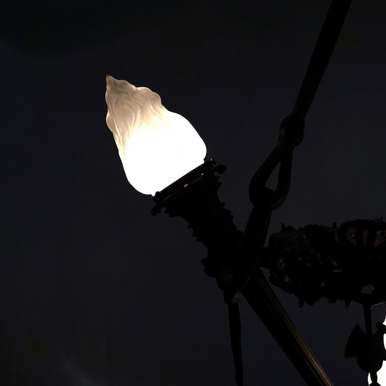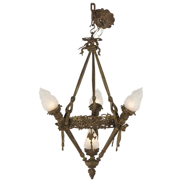 - Antique Gilt Bronze French Empire Figural Four Light Torch Hanging Fixture with Flame Form Shades Circa 1920