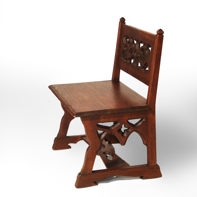 - An antique Gothic Arts & Crafts bench crafted from oak, dating to circa 1920. This small bench features intricate carved details on the backrest, showcasing the distinctive Gothic influence with its organic, flowing patterns. The bench is unsigned, typical of many Arts & Crafts pieces from this era, emphasizing craftsmanship over mass production. Its compact size makes it versatile for various settings.