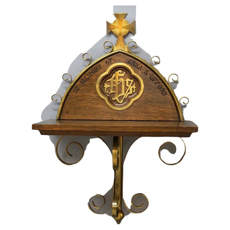 - Antique Gothic Oak and Scrolled Brass Communion Shelf 19thC
