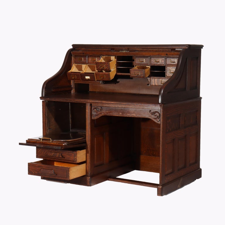 - Antique Gunn Furniture Co. Oak S Roll Top Paneled Single Pedestal Desk With Full Drawer Interior Signed C1920
