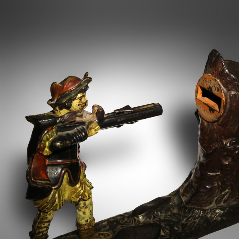 - This is an antique Creedmoor mechanical bank, attributed to J. E. Stevens, circa 1877. The bank features a detailed cast iron figure of a marksman aiming at a tree stump. Known for its intricate design and mechanical action, this piece is a fine example of late 19th-century American craftsmanship. The bank operates by placing a coin in the marksman's rifle, which then shoots the coin into the tree stump when activated.