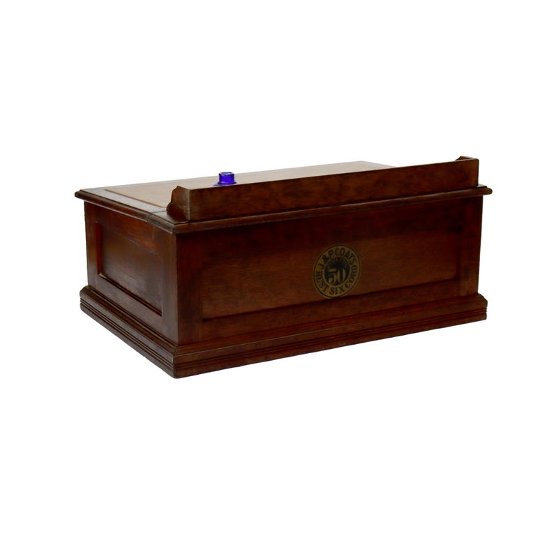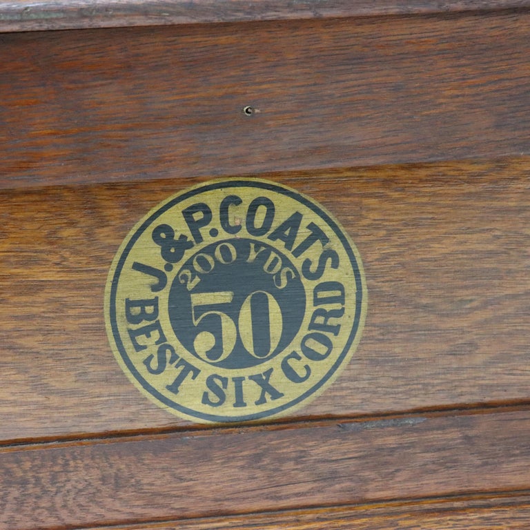 - This antique spool cabinet, crafted around 1890, is a fine example of J & P Coats' craftsmanship. Made from oak, it features four drawers with original brass knobs and painted labels, including 'BEST', 'SIX CORD', and 'SPOOL COTTON FOR HAND & MACHINE'. The lift top design adds functionality, allowing for additional storage or display space. This piece would have been used in a general store to display and store spools of thread.