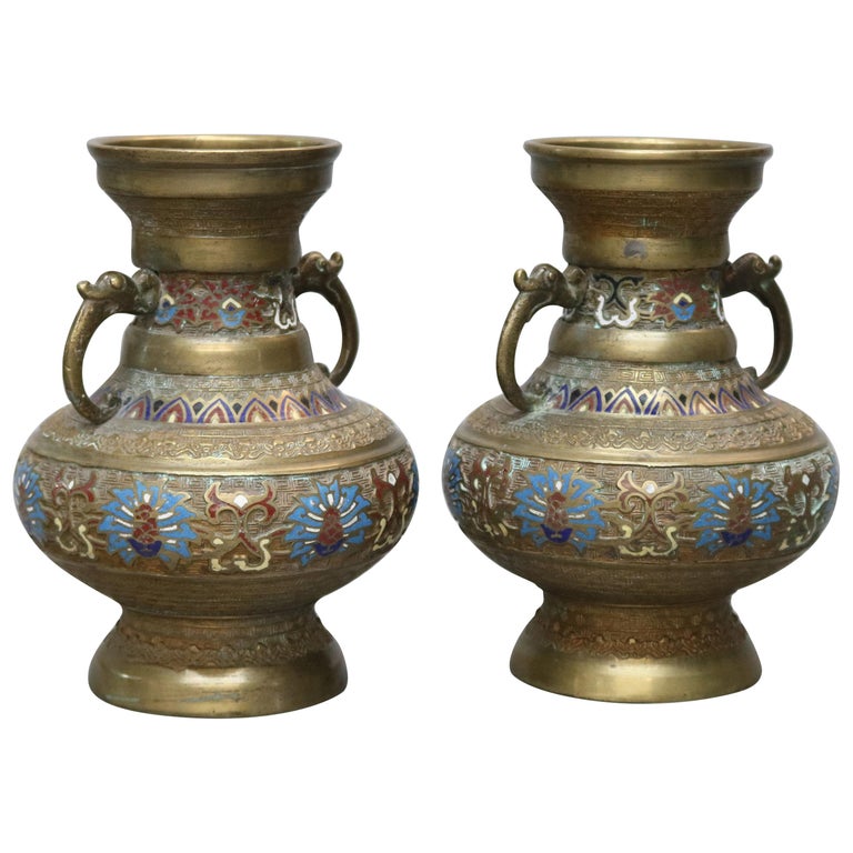 - An antique Japanese Persian style vase set offers Champlevé enameled bronze urn form vessels with figural double handles, decorative bands to include stylized floral, Egyptian reed, and geometric elements, circa 1900