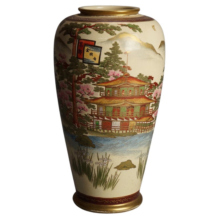 - Antique Japanese Satsuma Pottery Vase with Pagoda & Landscape C1920