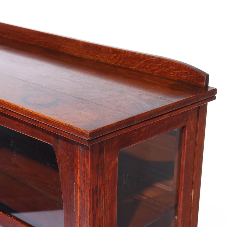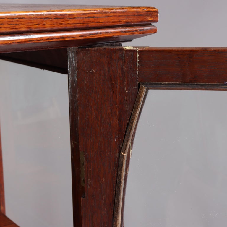 - This antique china cabinet is a fine example of the Limbert School's Arts & Crafts style, dating to circa 1910. Crafted from oak, it features two glass-paneled doors with a classic design that highlights the craftsmanship of the era. The cabinet offers ample display space with multiple shelves for showcasing fine china or collectibles. Its elegant simplicity and sturdy construction are characteristic of the Arts & Crafts movement, emphasizing both form and function.