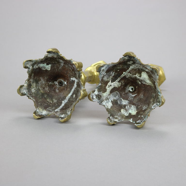 Antique Pair of Early American Brass Balustrade Footed Candlesticks 19th C