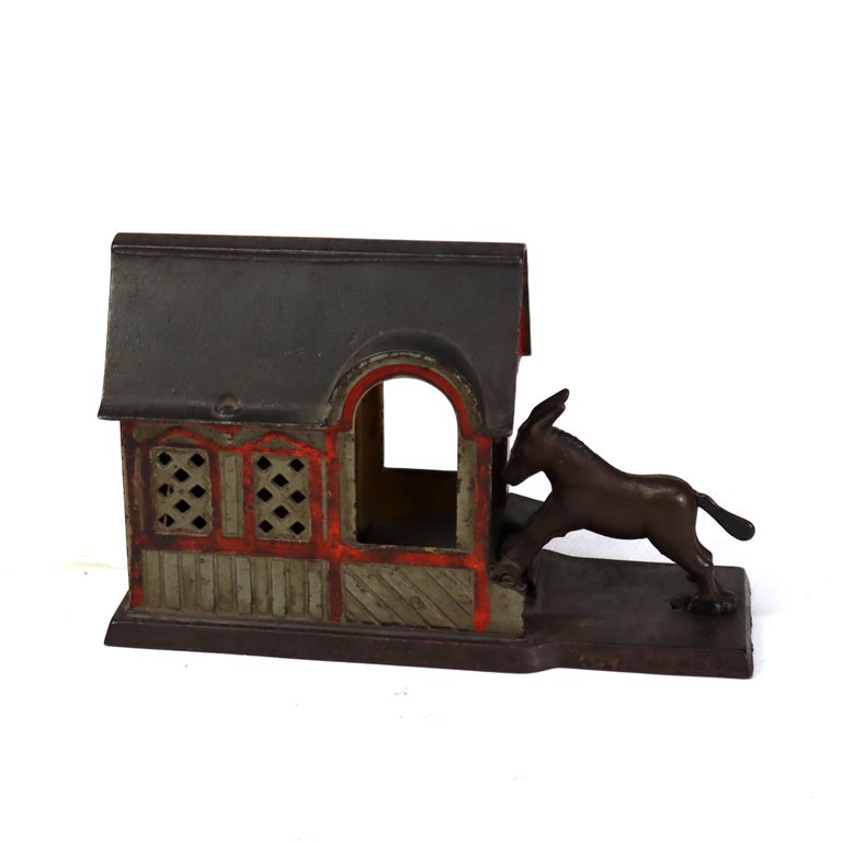 - This antique cast iron figural mechanical bank, dating to circa 1880, features a charming design with a donkey and a house or barn. The bank is crafted from cast iron and showcases intricate detailing, typical of the late 19th century. Mechanical banks from this era were popular collectibles, often used to encourage saving money in a playful manner.